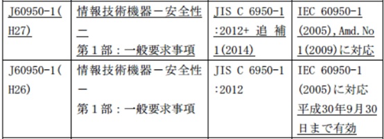 新标准J 60950-1 (H27) 将于2015年10月1日起施行, 与之相对应的国际标准版本为:IEC 60950-1: 2005 + Amd 1: 2009; 将于2018年9月30日开始强制 (即:旧标准J 60950-1(H26)失效日)。