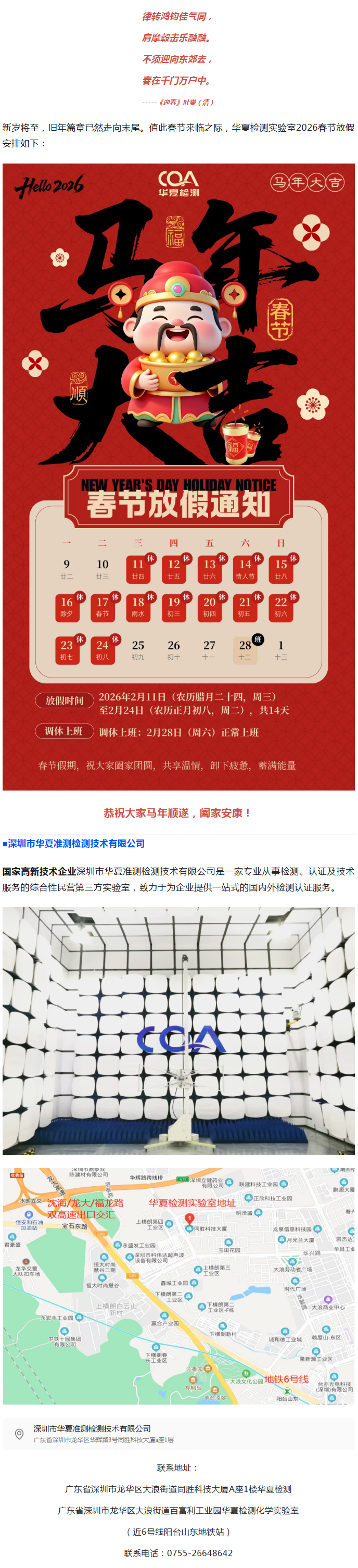 春祺夏安,秋绥冬禧---华夏检测实验室春节放假通知 2026-2-9