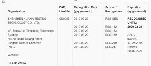 华夏检测实验室在认可列表中为113号,认可号码为ISED#:22984. 可通过ISED加拿大官网进行查询 http://www.ic.gc.ca/eic/site/mra-arm.nsf/eng/nj00160.html