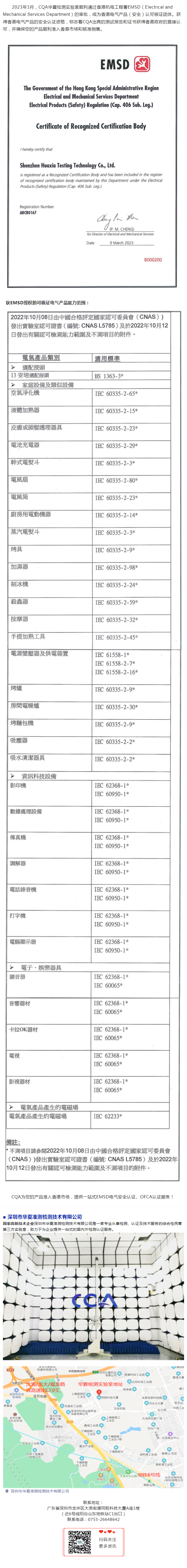 华夏检测获香港机电工程署EMSD电气产品(安全)认可核证团体授权
