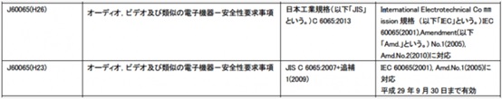 日本影音类标准目前版本为J 60065 (H26), 与之相对应的国际标准版本为: IEC 60065: 2001 + Amd 1: 2005 + Amd 2: 2010;将于2017年9月30日开始强制 (即:旧标准J 60065 (H23) 失效日)。
