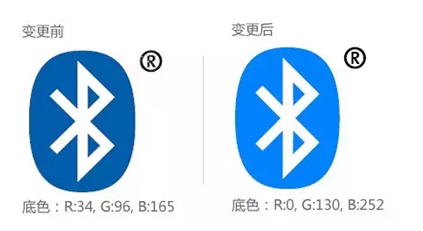1.调整了figure mark(徽标)的底色,底色由原来的RGB配比[R:34, G:96, B:165]调整为[R:0, G:130, B:252],由深蓝变更为亮蓝。你会注意到蓝牙标志颜色的变化,蓝牙商标底色由深蓝色变更为亮蓝色。以及全新的标语超越想象的连接“unthinkably connected”,意为蓝牙帮助人与技术之间建立的联系将超越想象。