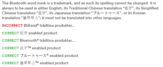 3.· 蓝牙文字商标不可任意修改。你可以用英语和繁体中文(藍牙)、简体中文(蓝牙)、日本(ブルートゥース),或韩语翻译(블루투스)。除此之外蓝牙文字商标不得译为任何其他语言。